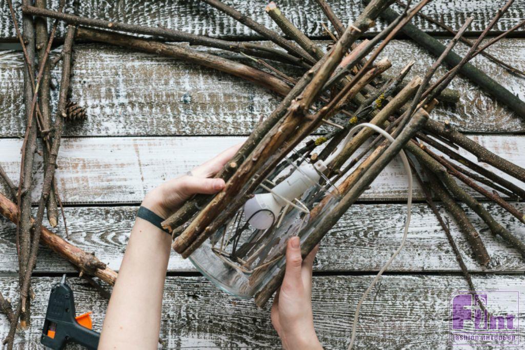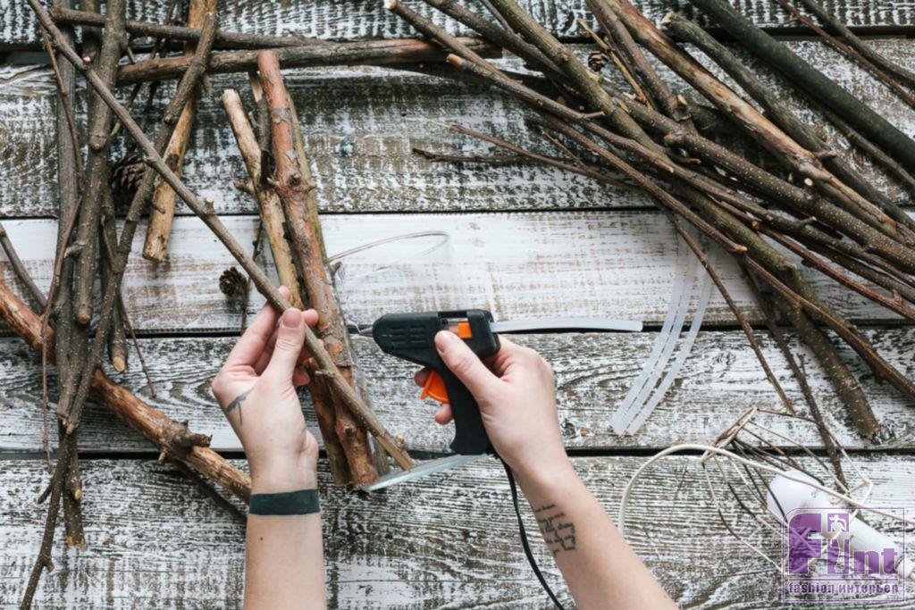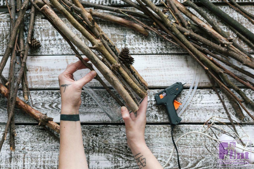 Шаг 3. Приклеивайте веточки к стеклянной вазе с помощью термопистолета, постепенно заполняя поверхность по кругу вазы. Не заклеивайте вазу слишком плотно, чтобы оставить небольшие промежутки между ветвями для прохождения света. На самом деле, такие щели получатся у вас сами по себе, поскольку веточки не идеально прямые, а имеют натуральные изгибы, благодаря которым свет будет проходить по бокам светильника.