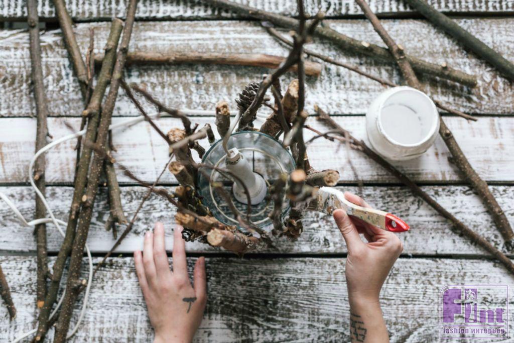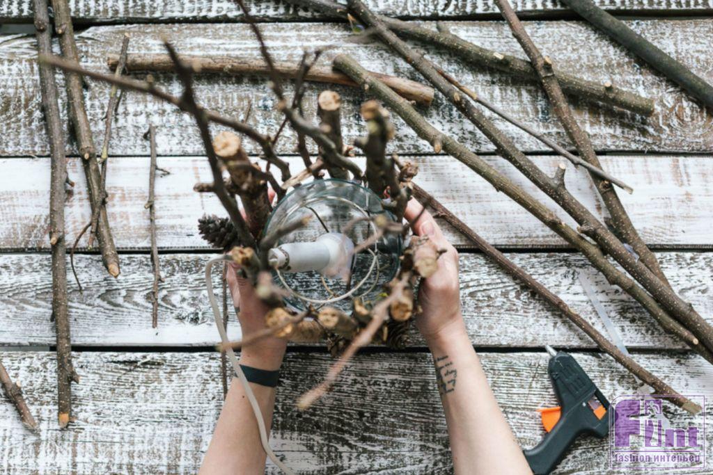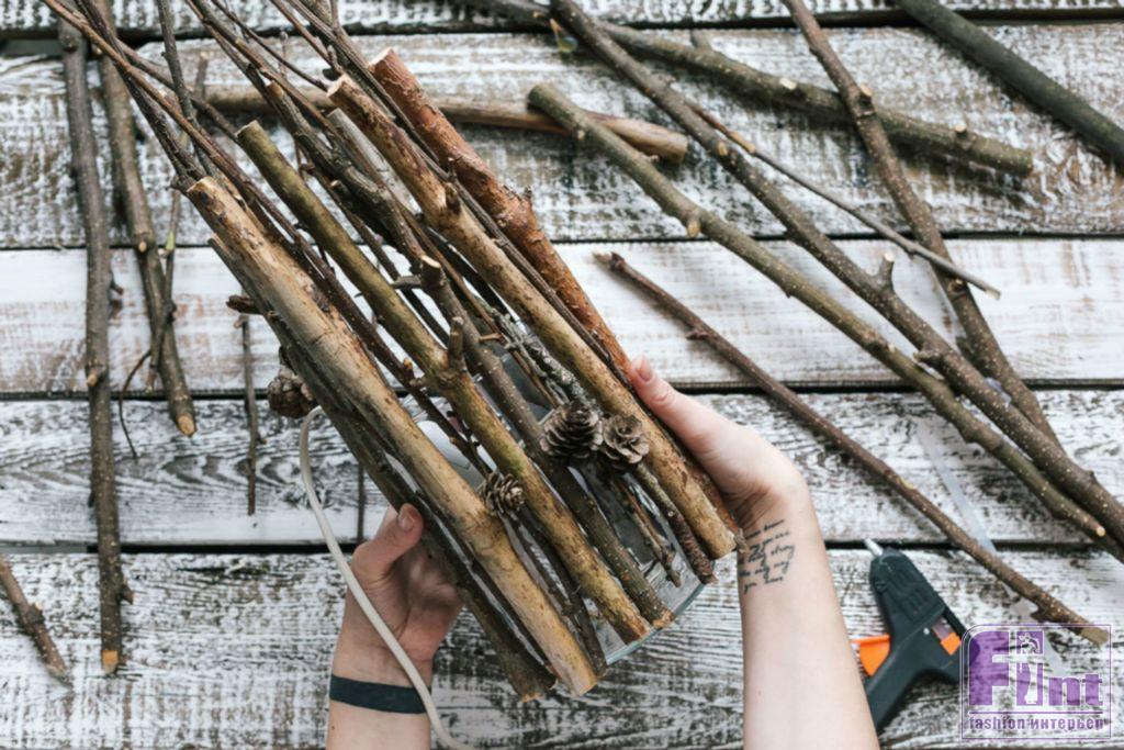 Шаг 5. После того, как вы приклеили веточки по всей окружности вазы, оцените свою работу и, при необходимости, доклейте более тонкие веточки в промежутках между основными – толстыми. Старайтесь, чтобы этот слой веточек не нарушил круглую геометрию светильника.