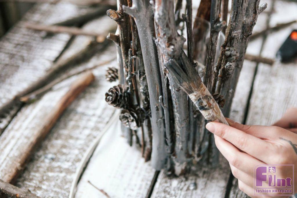 Шаг 7. Покрасьте веточки и шишки, применяя несколько техник и оттенков. Сначала покроем веточки снаружи акриловой грунтовкой по дереву, заколерованной в белый цвет.