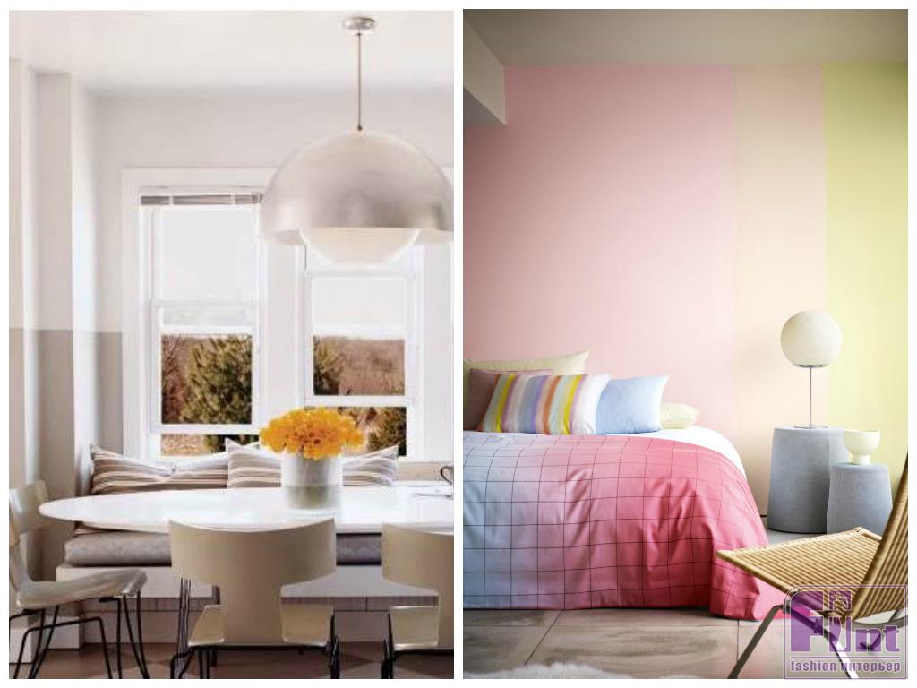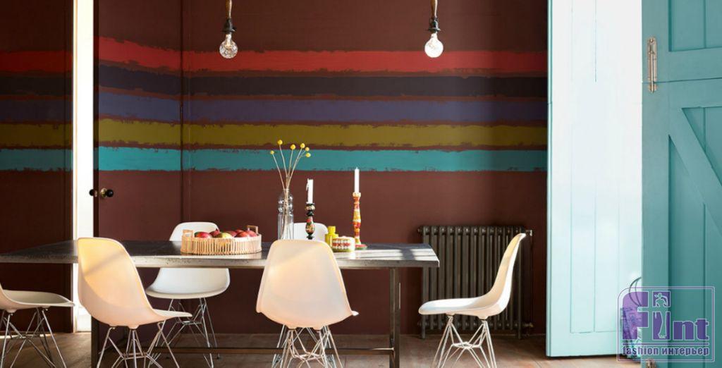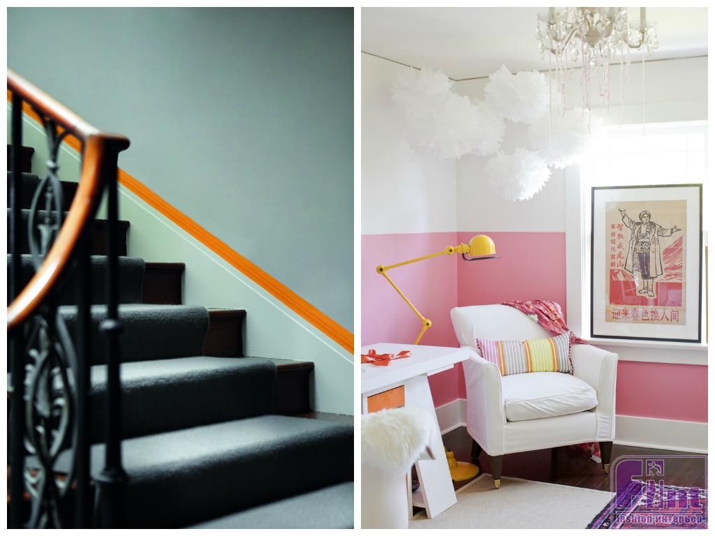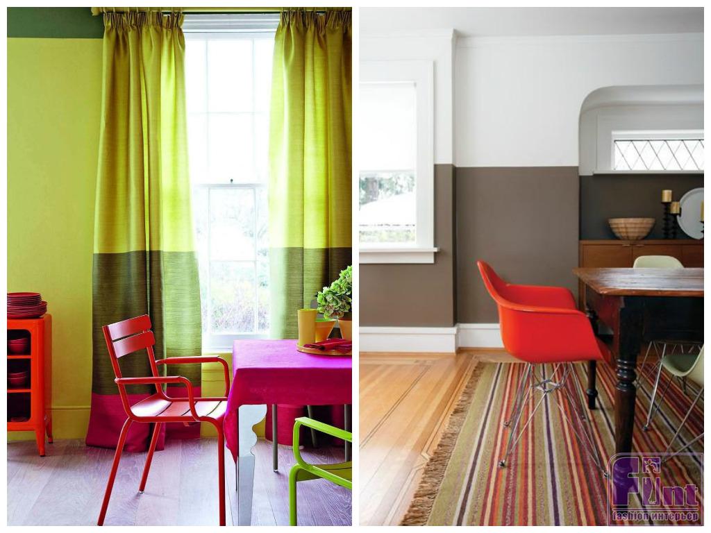 Для того чтобы получились идеально ровные и аккуратные границы между цветами, понадобится рука мастера и знание особенностей трафаретной техники окрашивания. Хотя на самом деле это не так уж и важно. Можно обойтись использованием в месте стыка двух красок интересных молдингов, деревянных реек, бордюров из камня или мозаики. В результате никто и не заметит неровности стыковки двух цветов.