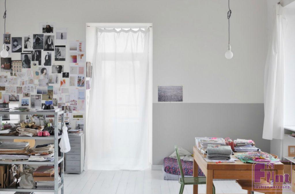Вы можете экспериментировать, окрасив, к примеру, одну стену в серый цвет, другую — в розовый с белыми вставками или же выделив какой-то выступ или нишу ярким оттенком. Но самый распространённый вариант — деление стены по горизонтали, когда часть поверхности окрашивается в один цвет, часть в другой. Чаще всего граница проходит на уровне 2/3 от пола, но можно делать её почти под потолком, посередине стены или выше середины.