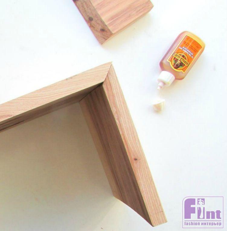 Склейте деревянные фрагменты. Они должны соприкасаться косыми кромками так, чтобы в результате у вас получилась конструкция, напоминающая сбоку «хромую» букву «П», у которой одна ножка короче другой в два раза. Для склеивания используйте обычный клей ПВА для дерева. Чтобы части столика приклеились друг к другу крепко, можно оставить нашу конструкцию под прессом на ночь, придавив столик в положении «на боку» чем-то тяжёлым или воспользоваться специальными угловыми струбцинами. Если у вас есть сомнения относительно крепости приклеивания, можно усилить крепление досок парой небольших саморезов, вкрутив их со стороны боковых «ножек» в верхнюю часто столика.