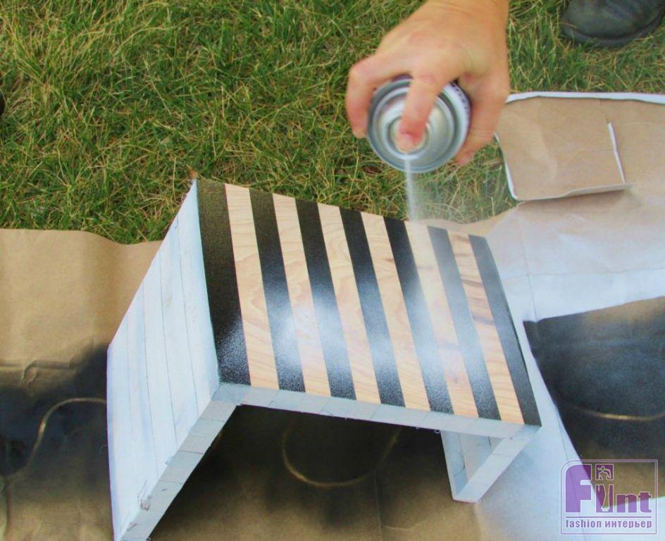 После того как клей высохнет, наклейте на лицевую поверхность конструкции полосы малярного скотча. Делать это лучше по предварительной разметке, выполненной через равные промежутки. Затем покройте внешнюю поверхность столика белой краской из пульверизатора. Делать это лучше всего на открытом воздухе, чтобы случайно не окрасить что-либо в помещении и не надышаться краской.