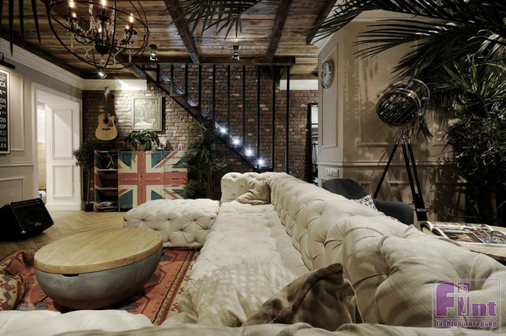 В интерьере использовано множество натуральных материалов, которые придают квартире облик уютного загородного дома. При первом взгляде на квартиру, можно отметить проходящий сквозь всё пространство лейтмотив стиля лофт. Действительно, в квартире много элементов, обычно используемых в этом урбанистическом стиле: деревянные потолки из состаренного обожжённого дерева, открытая кирпичная кладка на акцентных стенах, металлическая лестница и аксессуары в виде больших настенных часов и напольного проектора, играющего роль торшера. Да и цветовая гамма общественной зоны также отсылает нас к стилю лофт.