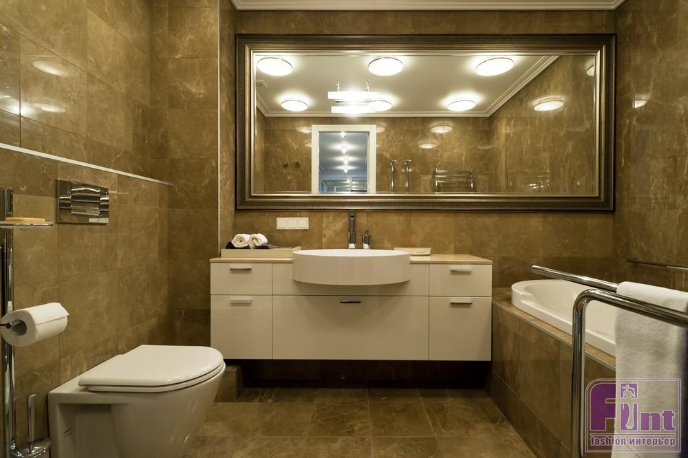 Обе ванные комнаты выполнены в одной стилистике, но с разным наполнением: в первой — просторная ванна, во второй — большая душевая кабина.