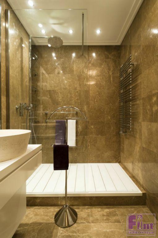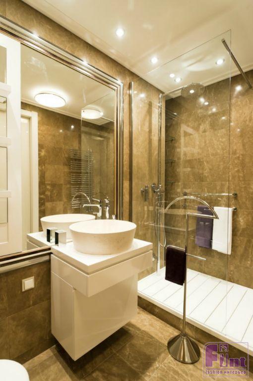 Обе ванные комнаты выполнены в одной стилистике, но с разным наполнением: в первой — просторная ванна, во второй — большая душевая кабина.