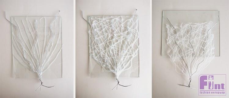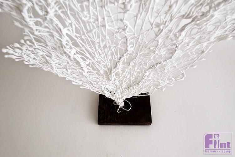 Чтобы коралл стоял на ровной поверхности, все концы проволок, использованной для скрепления «веточек», нужно скрутить и согнуть в форме подставки. После изготовления белого коралла, мы закрепим оба наших изделия на фанерную основу.