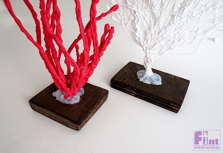 При изготовлении коралла своими руками мы получим элемент интерьера, идеально подходящий под наше помещение по цвету, размеру и форме. Чтобы украсить своё жильё рукотворной композицией из кораллов, сделаем не один, а сразу два коралла, используя клеевой пистолет с горячим клеем, который есть практически у каждого , кто любит рукоделие. Вам понадобится: тонкая проволока; клеевой пистолет с горячим клеем; акриловая краска; кисточка; небольшой кусок фанеры для подставок; гвозди и молоток.