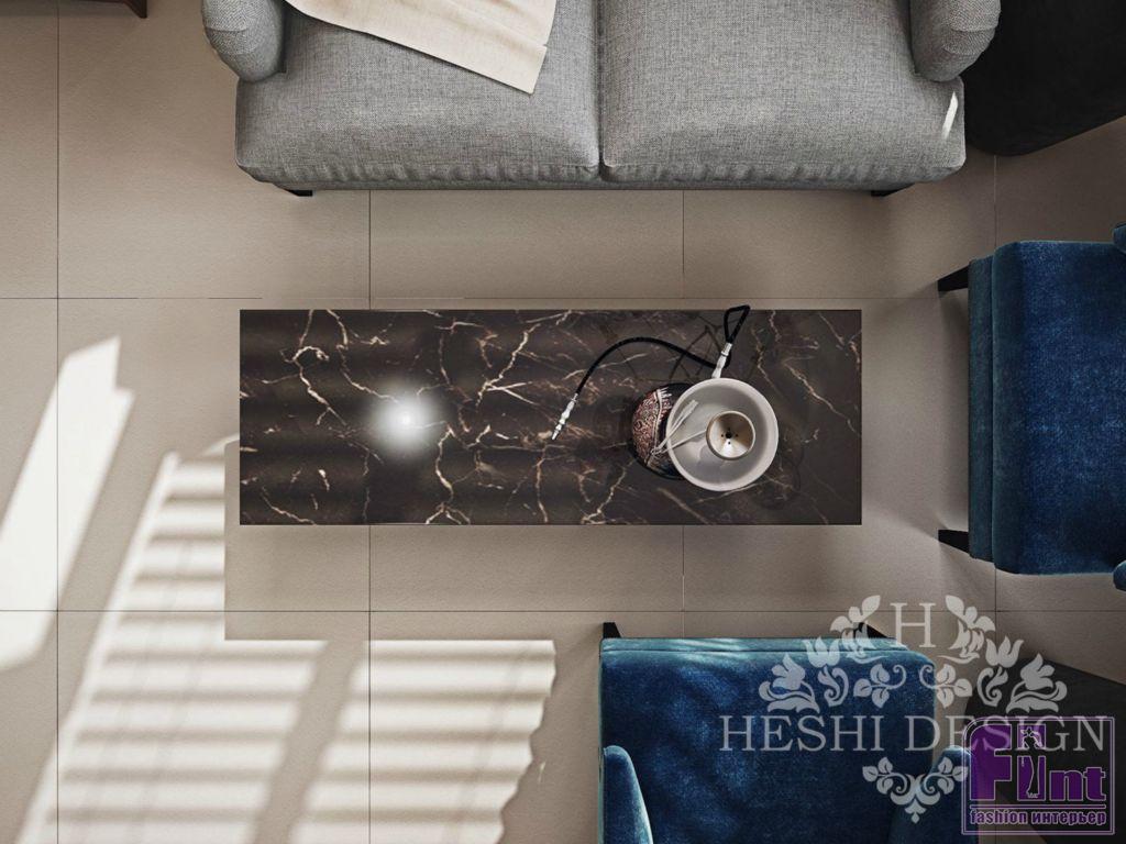 Азиатские аксессуары использованы Юлией не случайно. В зоне отдыха, организованной в небольшом эркере, дизайнер спланировала и реализовала настоящую кальянную комнату с присущими ей аксессуарами: мягкими и удобными креслами, низким и широким журнальным столиком и, конечно же, самим кальяном. Дополняют интерьер кальянной зоны два массивных напольных кашпо с крупнолистовыми живыми растениями.