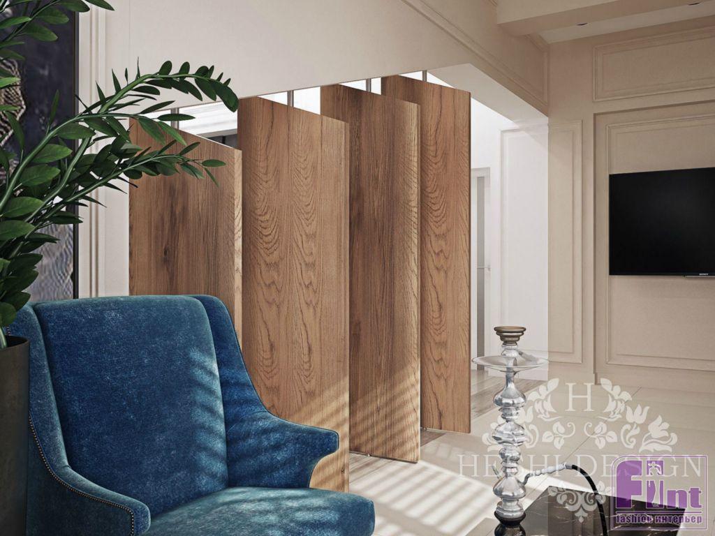 Оригинально зонированное помещение спальни и прилегающих зон решено дизайнером в мягких пастельных тонах с использованием акцентных цветовых вкраплений. За цветовые акценты в интерьере отвечают классические английские кресла с высокой спинкой и пуфик в спальне, обтянутые мягкой бархатной тканью ярко бирюзового оттенка.
