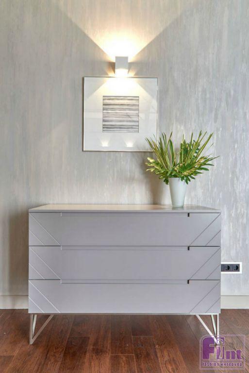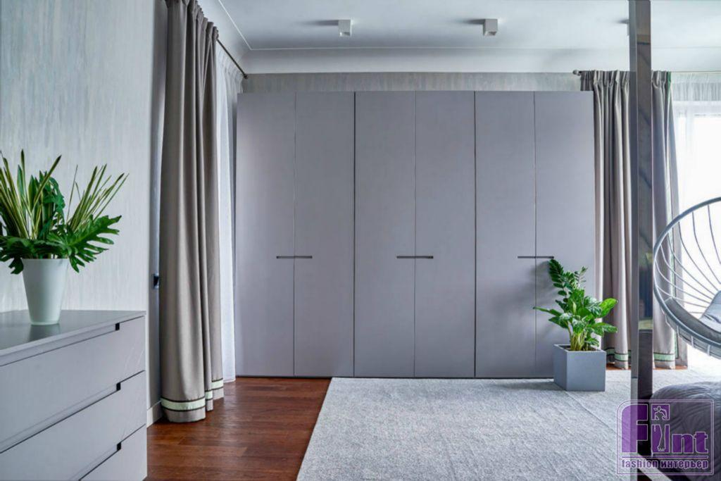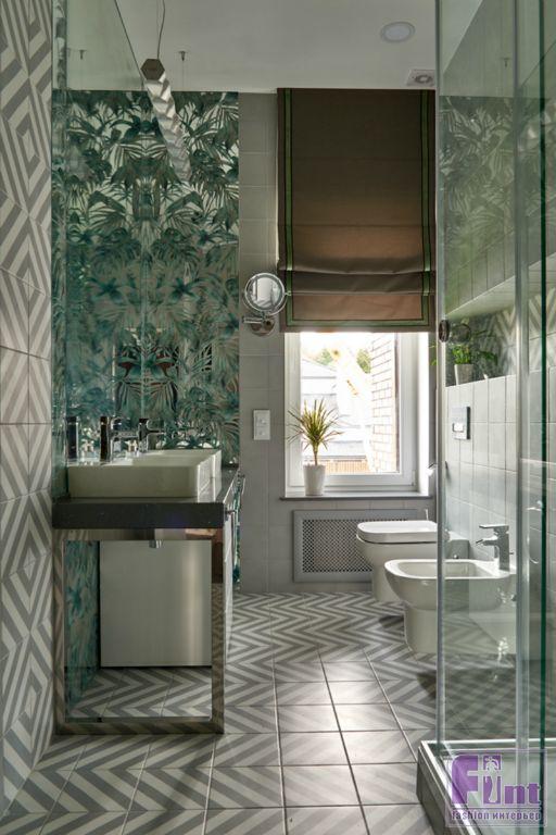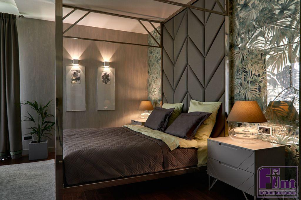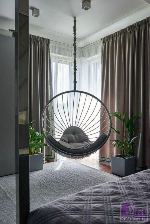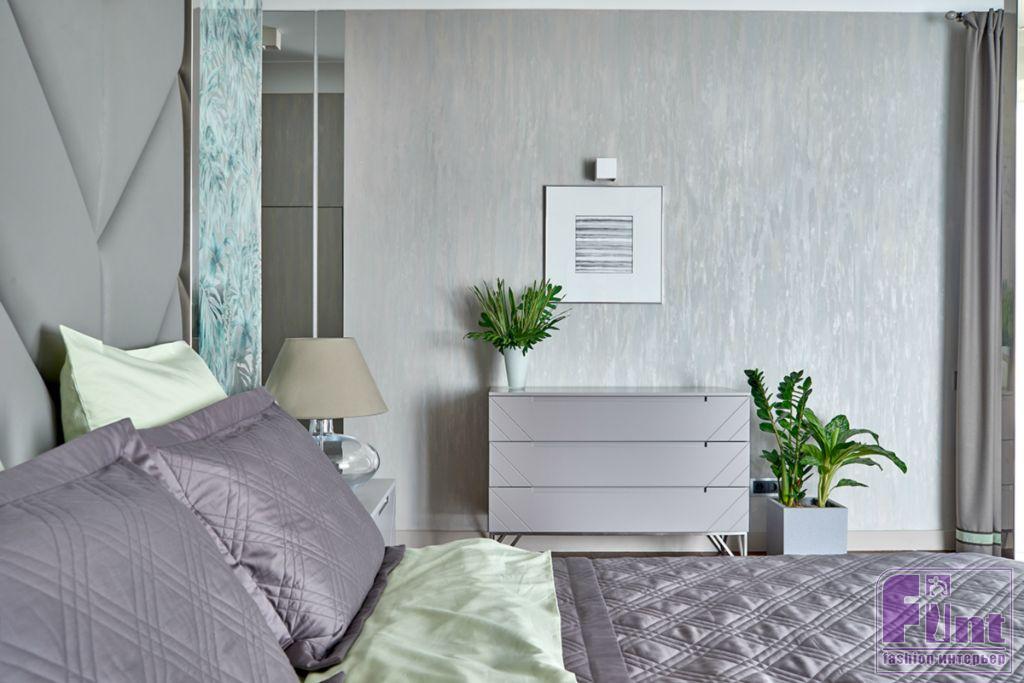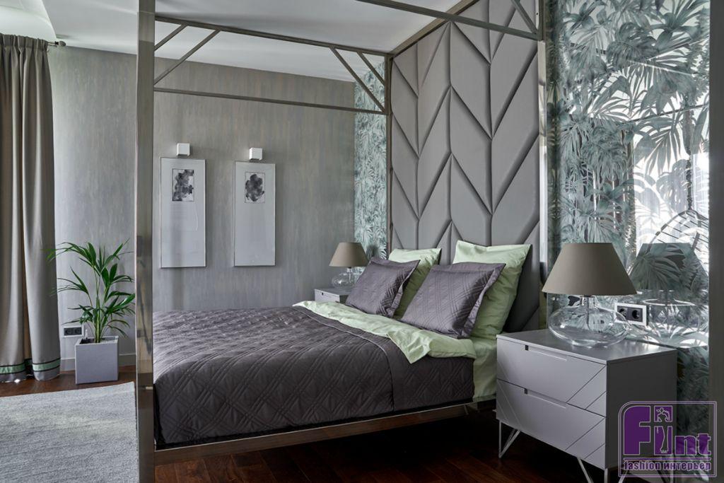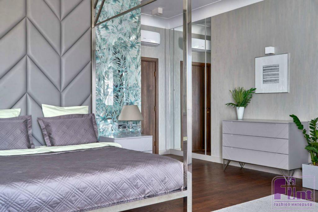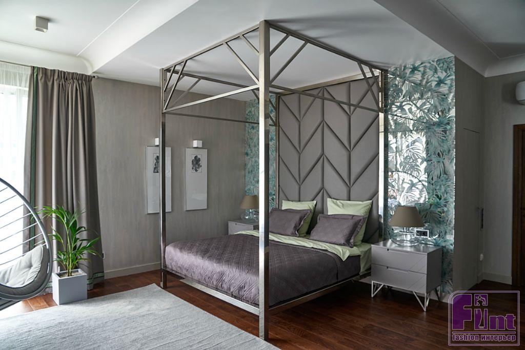Ванную комнату декорировали испанской плиткой с геометрическим рисунком и зеркалами. Такими же оригинальными зеркалами, выполненными на заказ, было решено украсить и спальню. Рядом с большим окном подвесили на металлическом каркасе светлое кресло из натурального ротанга, а центральную часть комнаты заняла стальная конструкция, на которой установили хромированную кровать. Большое угловое окно задрапировали тканью в серых тонах. Серебристый ковер ручной работы привезли из Самары.