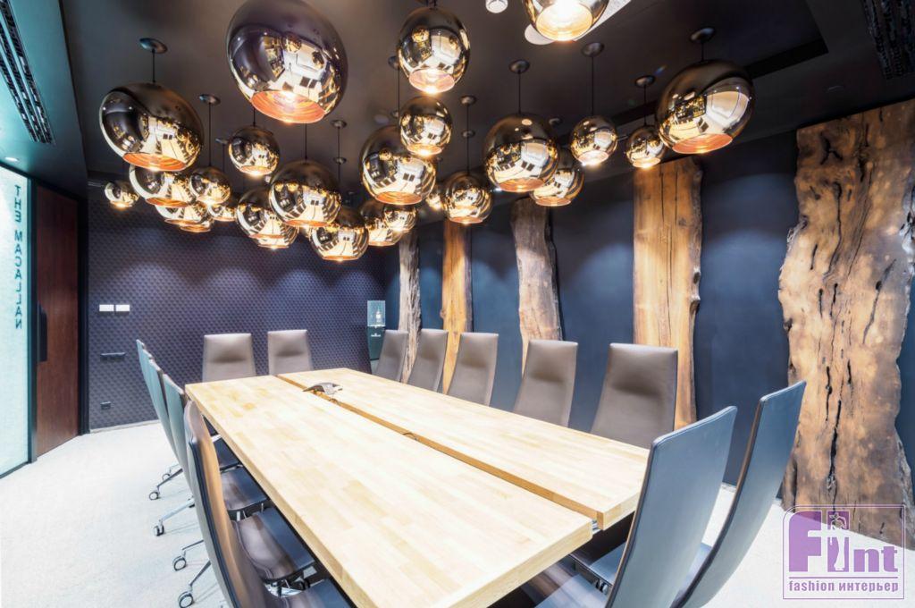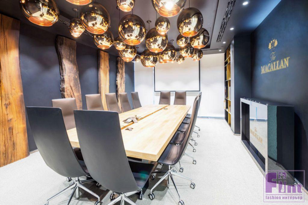 На стенах переговорной, посвященной The Macallan, были установлены натуральные слэбы — продольные срезы ствола дерева, а потолок оборудован светильниками сферической формы с зеркальным покрытием.