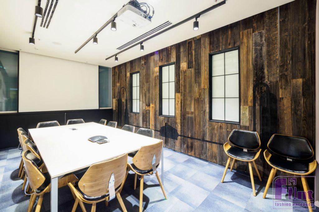 Переговорная, оформленная в стиле легендарного бурбона Jim Beam, отделана амбарными досками, придающими помещению брутальный вид.