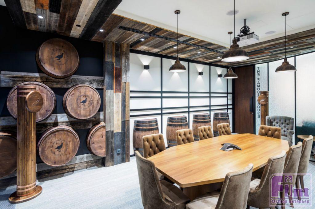 На стенах переговорной, посвящённой традиционному шотландскому виски The Famous Grouse, закреплены дубовые бочки, в которых выдерживались лучшие сорта напитка.