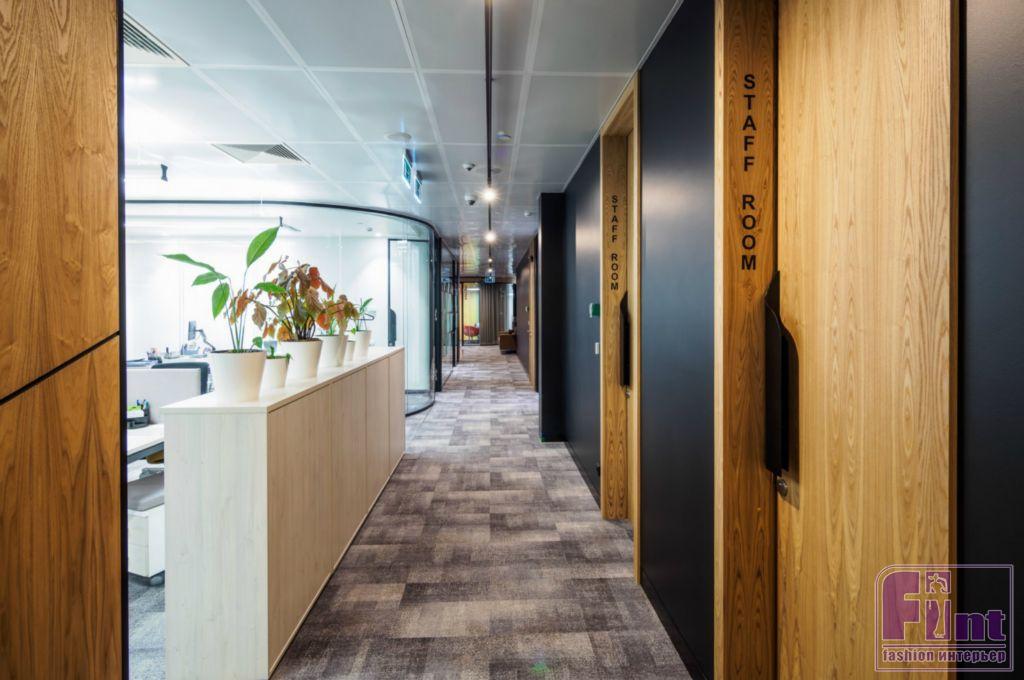 По всему офису установлены перегородки, выполненные с учетом разных типов отделки помещений, в том числе со шпонированной рустованной поверхностью. Некоторые кабинеты располагаются за стеклянными перегородками закруглённой формы, за счёт чего сохраняется ощущение открытого рабочего пространства.