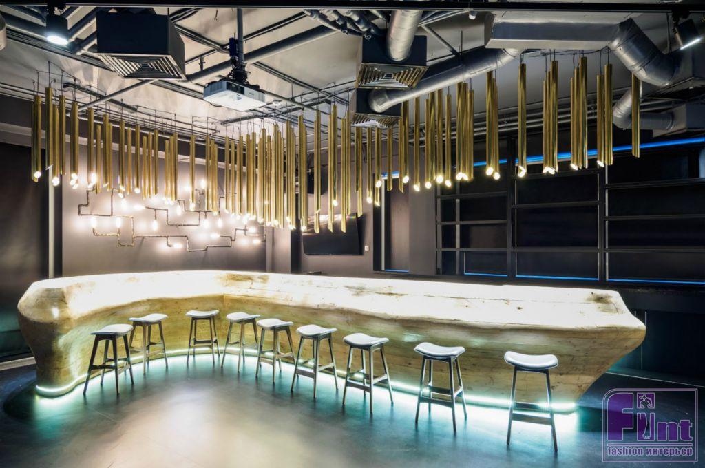 Главным украшением помещения является необычная барная стойка с подсветкой у основания. Над стойкой располагаются оригинальные лампы разной длины. Стены барной зоны украшают объёмные надписи — названия марок алкоголя, и светильники в виде ломаных линий труб. Зона бара может объединяться с двумя переговорными комнатами, образуя большое единое пространство для проведения мероприятий.