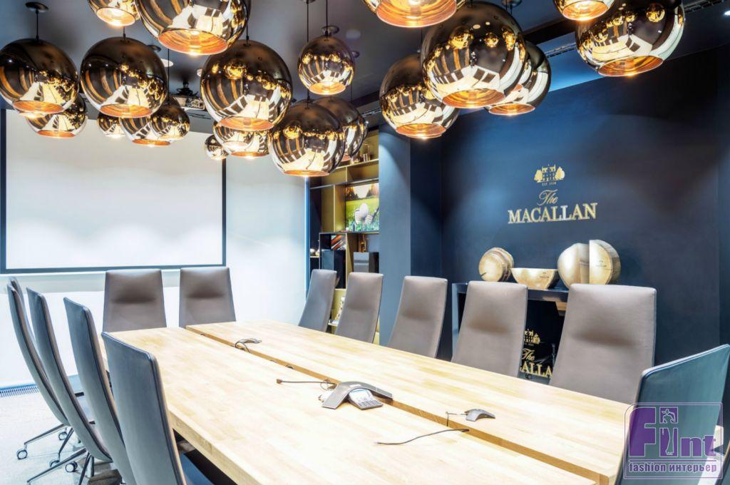 На стенах переговорной, посвященной The Macallan, были установлены натуральные слэбы — продольные срезы ствола дерева, а потолок оборудован светильниками сферической формы с зеркальным покрытием.