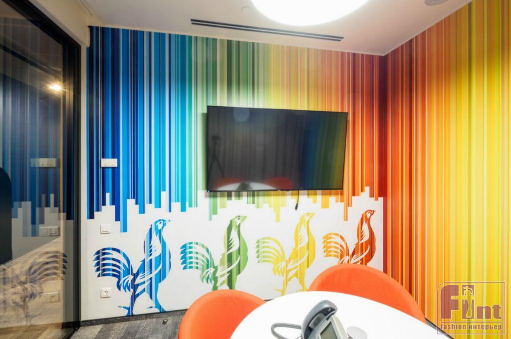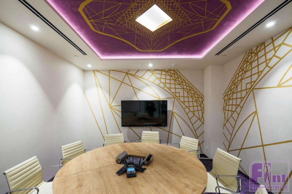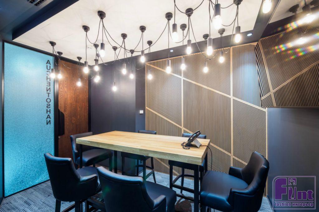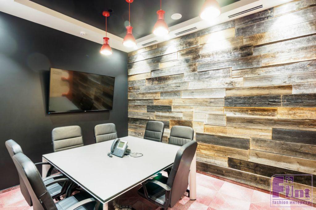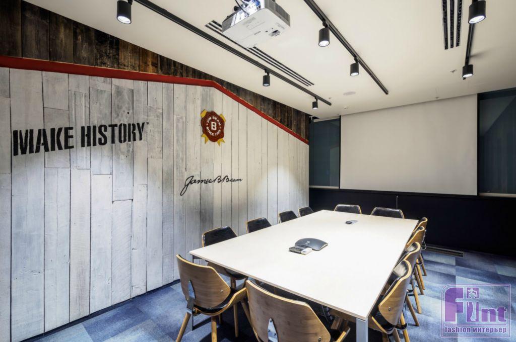Переговорная, оформленная в стиле легендарного бурбона Jim Beam, отделана амбарными досками, придающими помещению брутальный вид.