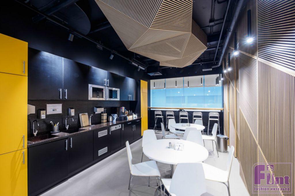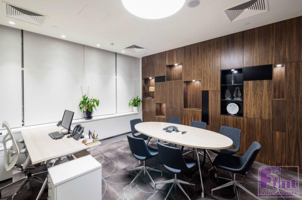 По всему офису установлены перегородки, выполненные с учетом разных типов отделки помещений, в том числе со шпонированной рустованной поверхностью. Некоторые кабинеты располагаются за стеклянными перегородками закруглённой формы, за счёт чего сохраняется ощущение открытого рабочего пространства.