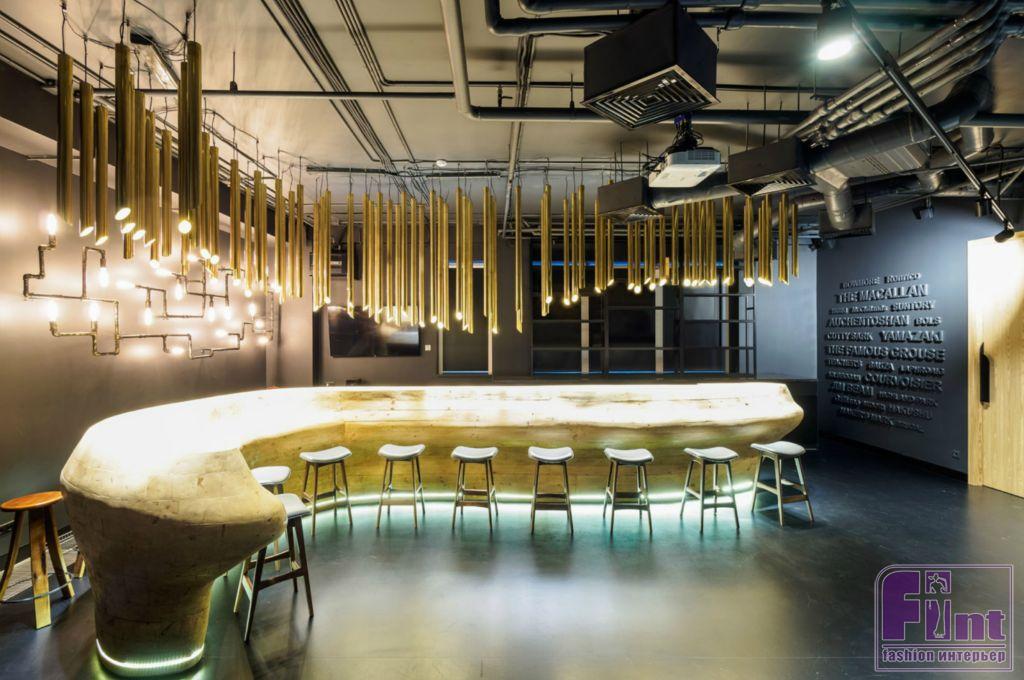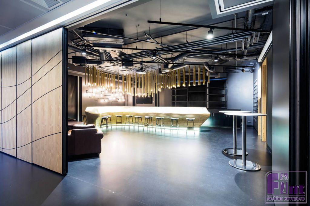 Главным украшением помещения является необычная барная стойка с подсветкой у основания. Над стойкой располагаются оригинальные лампы разной длины. Стены барной зоны украшают объёмные надписи — названия марок алкоголя, и светильники в виде ломаных линий труб. Зона бара может объединяться с двумя переговорными комнатами, образуя большое единое пространство для проведения мероприятий.
