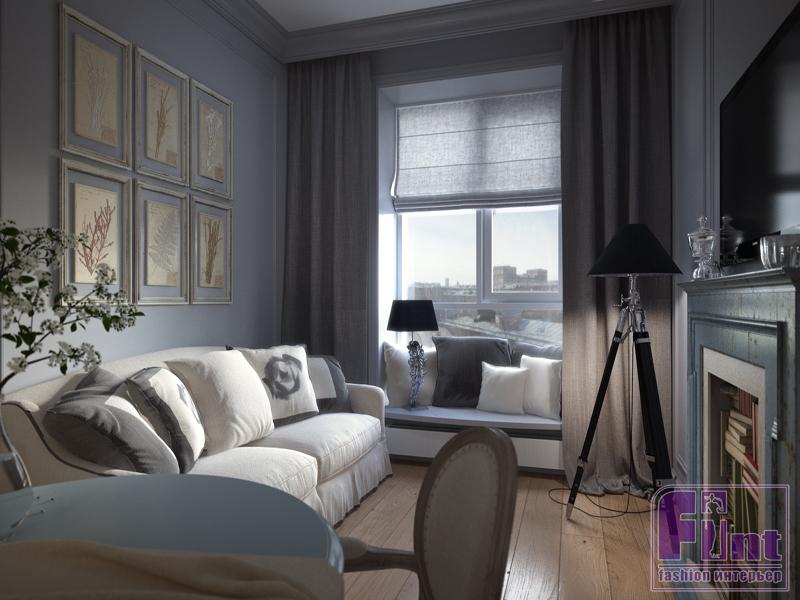 Так стены гостиной окрасились в серо-голубые тона, создающие сумеречную и одновременно романтичную атмосферу, а спальная зона — в сдержанные пастельные оттенки. Благородную строгость интерьеру придали молдинги, а также натуральные материалы, среди которых лён, хлопок и шерсть. Из-за специфики жилого пространства квартиры-студии гостиная совмещена с кухней и столовой. Функционально помещение зонировано с помощью меблировки. Большая часть мебели, как для гостиной, так и для всей квартиры, выполнена на заказ.