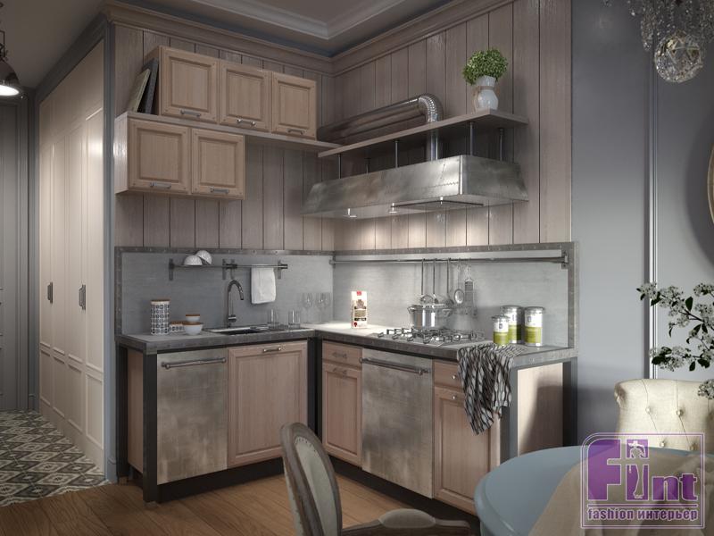 Обращает на себя внимание довольно необычный кухонный гарнитур. Он состоит из массива дуба, металлических элементов и столешницы из бетона. Несмотря на явно прослеживающийся «лофтовый» стиль кухонного гарнитура, по мнению дизайнера, она гармонично вписалась в интерьер. На кухне, благодаря перепланировке, соорудили специальную нишу, подняли её над полом и поместили туда встраиваемые холодильник и духовой шкаф. Таким образом удалось разгрузить пространство зоны приготовления пищи и добавить в скромный по габаритам интерьер ещё немного «воздуха».