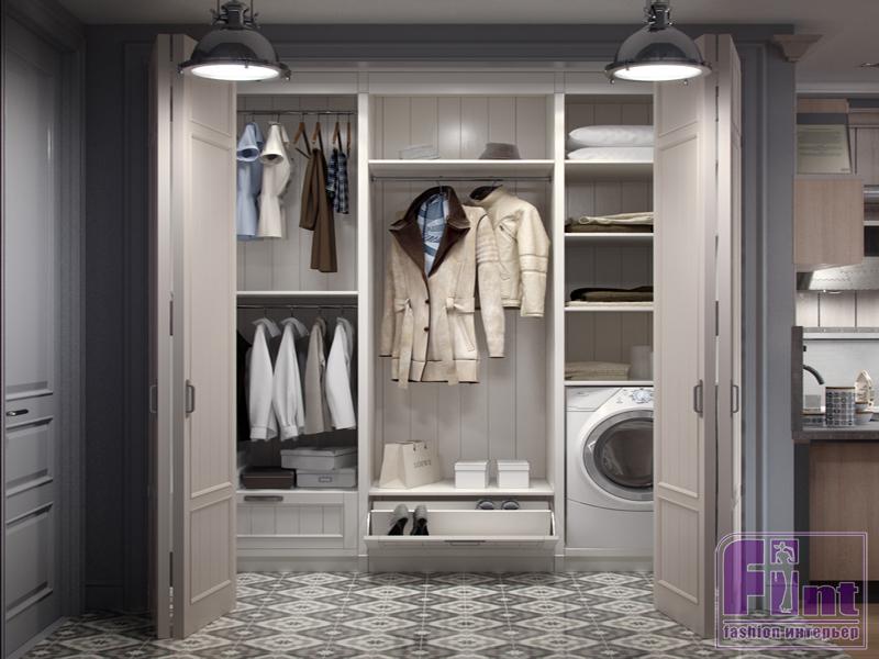 По замыслу дизайнера, интерьер снабдили многочисленными системами хранения, позволившими деликатно скрыть вспомогательные пространства квартиры. Так, в прихожей организовали гардеробную за складывающимися дверями. Помимо основной функции по хранению одежды и обуви, гардеробная вмещает также стиральную машинку, аккуратно вписавшуюся в эту коридорную систему хранения.