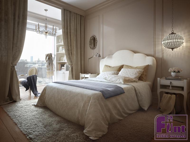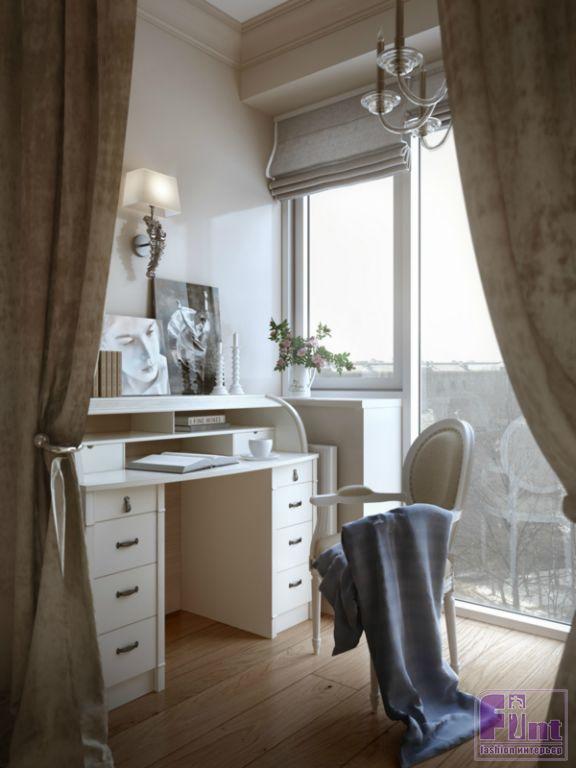 В ходе перепланировки была снесена стенка в спальне, в результате чего спальня стала больше по метражу и намного функциональнее. Для создания уюта в приватной зоне сделали зонирование с помощью плотных портьер, которые подвешены на потолочную шину за декоративным молдингом, отделяющим спальню от рабочего кабинета. Для создания рабочего кабинета существующую лоджию утеплили и переоборудовали, создав полноценное пространство с рабочим столом и книжным шкафом.