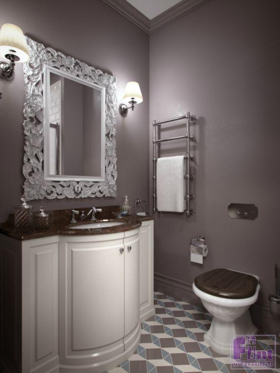 В санузле использовали сочетание контрастных шоколадных и светлых оттенков. Акцентным элементом санузла стало зеркало в массивной резной раме, по бокам от которого разместили стилевые настенные светильники, отлично дополнившие интерьер санузла.