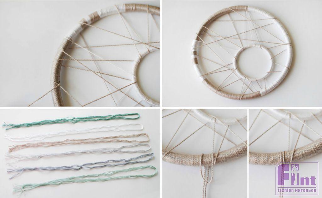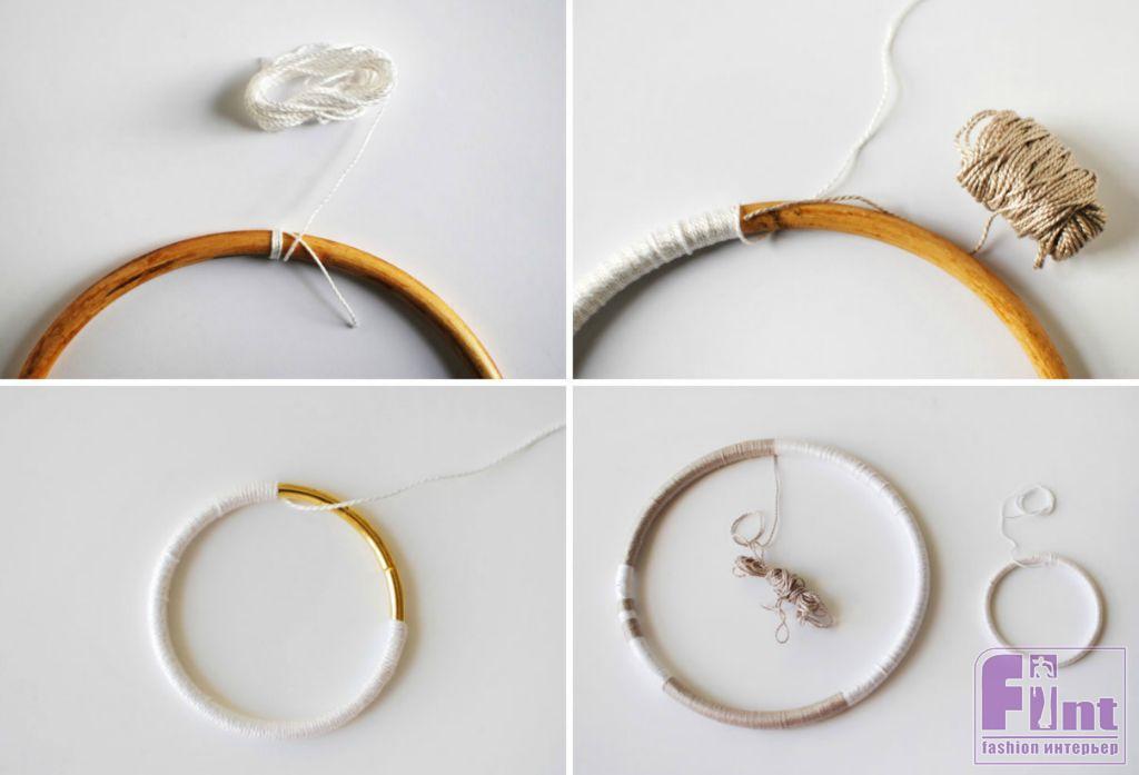 Сначала нужно обмотать большой обруч нитками двух цветов. Чтобы закрепить начало нити, положите её вдоль обруча и начните наматывать первые витки прямо по лежащему концу нити, который будет надёжно закреплён витками. Продолжайте наматывать нить вокруг обруча, стараясь делать витки как можно плотнее, пока не покроете, по крайней мере, одну треть обруча.