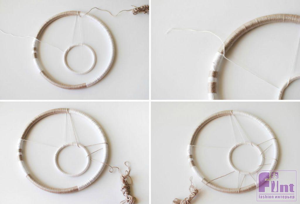 Поместите маленькое кольцо внутрь обруча и начните крепить его с помощью концов ниток, оставшихся на первом этапе от обматывания большого обруча. Закрепите нитку на большом обруче узлом, отрезав лишние нитки как можно ближе к узлу. Используя дополнительные нитки двух цветов, создайте «паутину» из ниток, удерживающую маленькое кольцо в выбранном месте внутри большого обруча. Крепите нитки обычными узлами, отрезая излишки.