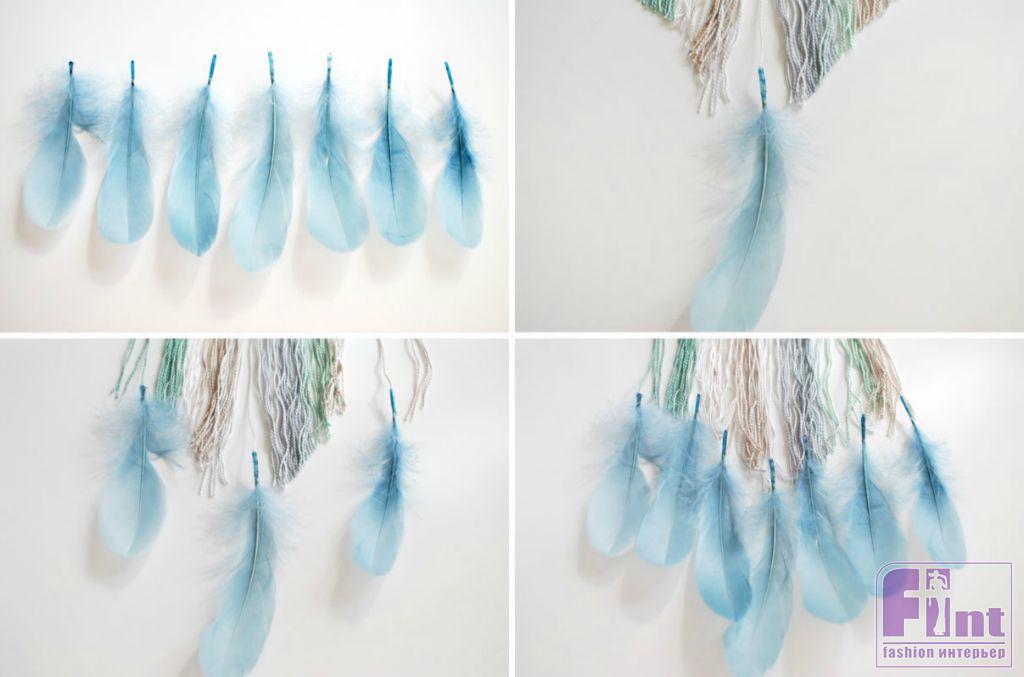 Соединение перьев с нитками – непростой процесс, поэтому держите наготове тряпочку, чтобы удалять излишки клея и держать пальцы в чистоте. Аналогично первому, приклейте оставшиеся 6 перьев.