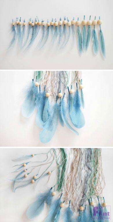 Разместите большие перья на нижней части бахромы, учитывая их размер: самое крупное перо – в центре бахромы, самые маленькие – по краям. Найдите нить, находящуюся примерно в середине нашей бахромы и, используя клей, присоедините самое большое перо к нитке.