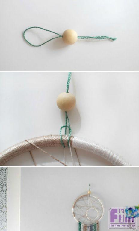 Отрежьте нить длиной примерно 25 см, сверните её пополам и завяжите концы узлом. Наденьте на получившееся кольцо из нитки крупную деревянную бусину. Закрепите петлю на большом обруче и наш стильный ловец снов готов к тому, чтобы украсить стену вашей спальни!