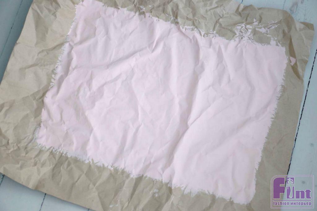 После того, как вы отрезали необходимый прямоугольник из бумаги, приступаем к созданию рельефа. Для этого нужно тщательно скомкать бумажный лист, фактически скатав его в небольшой шарик. Чем плотнее вы сожмёте лист, тем мельче будет фактура будущей картины. Распрямите бумагу и проверьте, как она выглядит. Если результат формирования рельефа вас не устроил, можно смять ещё один лист бумаги, пока результат вас не удовлетворит.