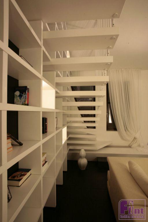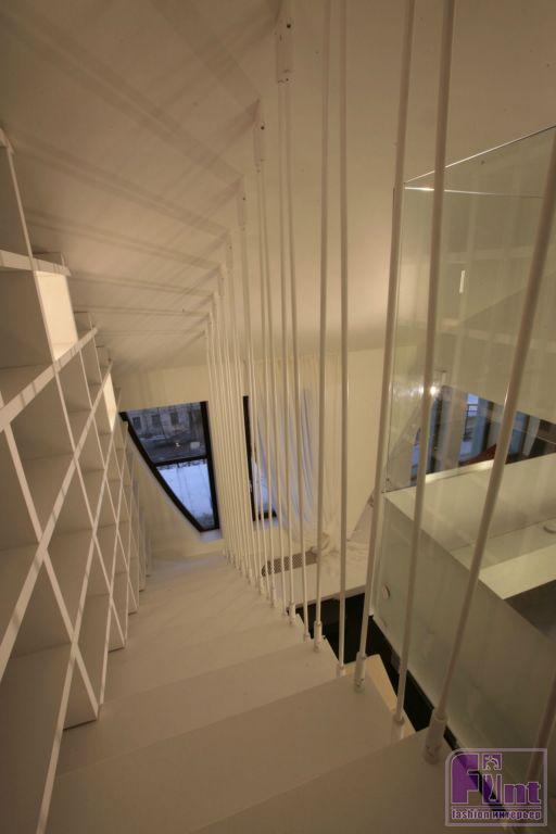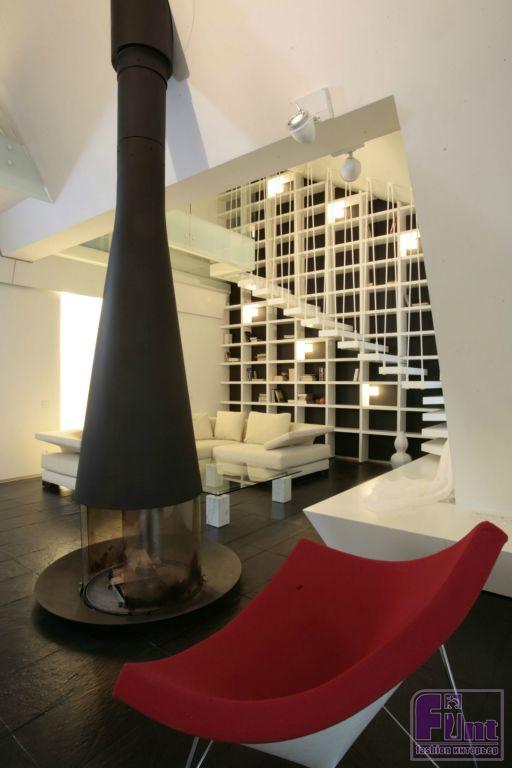 К счастью, у дизайнеров была возможность присоединить к квартире бывшее техническое помещение чердака, что не только значительно увеличило её площадь, но и позволило обустроить полноценный мансардный этаж. На нём, в частности, разместили спальню, гардеробную и ванную, тогда как первый этаж отвели под общественную зону с камином и натуральным сланцем на полу.