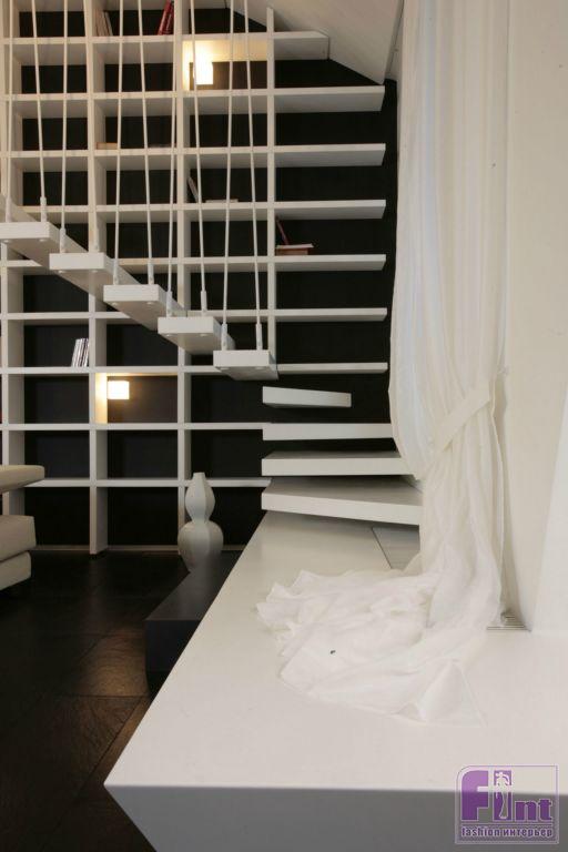 Помимо собственно планировочного решения, на создание эффекта воздушности пространства «работают» и многочисленные детали: консольные ступени, стрельчатые окна в пол, стеклянные перегородки, вертикаль камина. Архитектура северного модерна, под который стилизован дом, нашла продолжение в интерьере: на стенах появились графические принты с рисунками начала прошлого века. Одно из главных стилистических решений, направленных на создание воздушного пространства, — «летящие» консольные ступени, выступающие из стены.