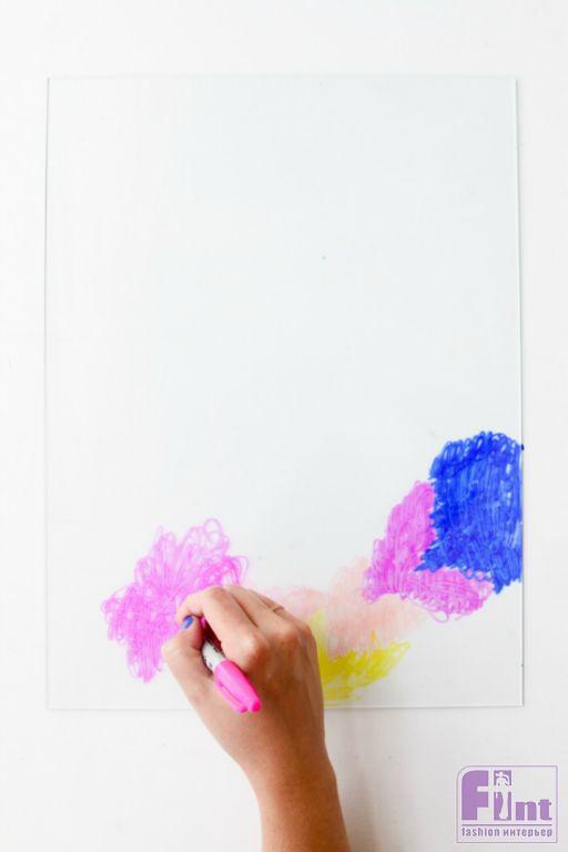 Шаг 2. Выберите цветовую схему для нашего будущего панно. В данном случае совершенно не важно, какие цветовые сочетания вы решите использовать. Главное, чтобы они соответствовали стилю вашего интерьера. Положите стекло из рамки на ровную поверхность и начните заштриховывать довольно большие участки стекла, чередуя цвета. Меняйте размер закрашиваемых областей, совмещая более крупные закрашиваемые области с более мелкими, создавая «мозаику» из цветных пятен. Закрасьте таким способом всю поверхность стекла.\