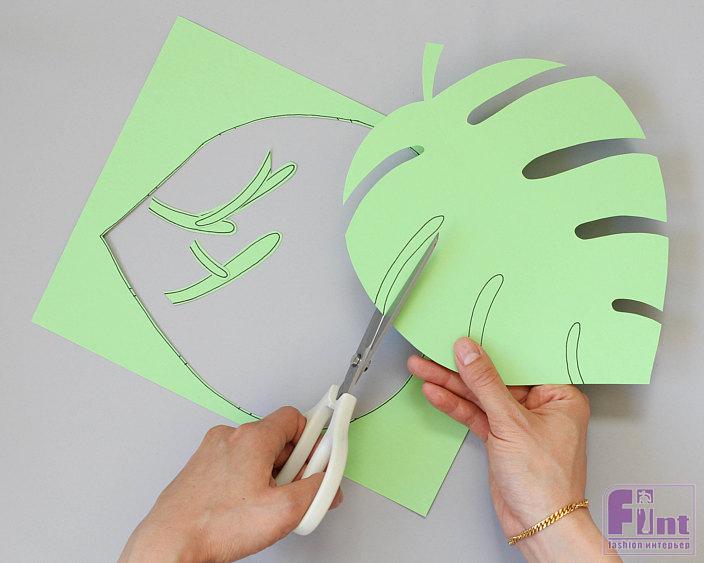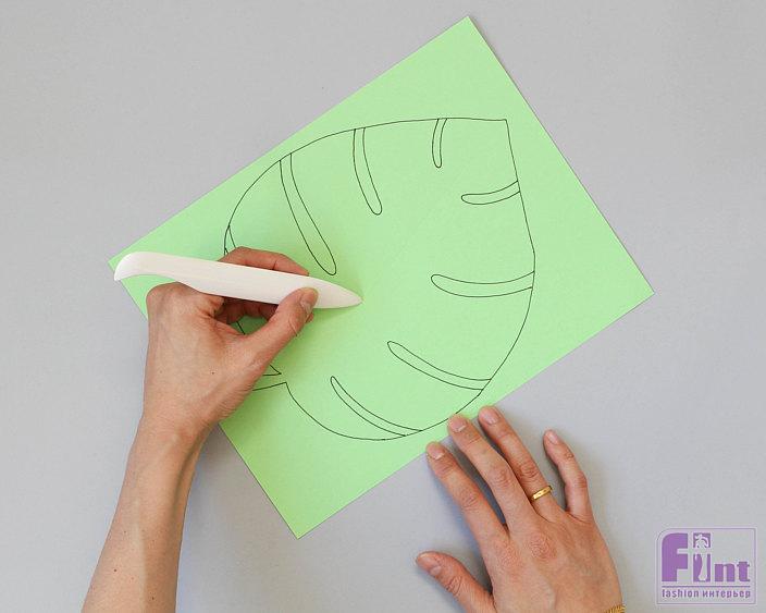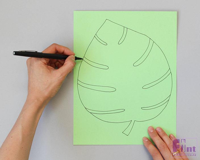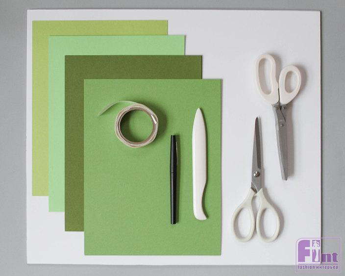 Для того чтобы сделать стильное 3D-панно, нам потребуется много вырезанных из цветной бумаги листиков разных размеров. На листах бумаги рисуем или переводим по трафарету изображения сочных зелёных листиков от различных тропических пальм и растений. Кстати, шаблоны таких листиков можно без труда найти в интернете.
