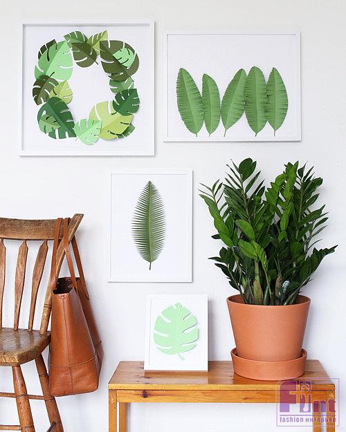 Листики необходимо закрепить на основу рамки для фото с помощью обычного двустороннего скотча. Причём для получения 3D-эффекта, приклеивать на скотч мы будем только одну половину листа, оставляя висящей в воздухе вторую половинку. Осталось повесить наши стильные панно на стену и наслаждаться буйством тропической зелени, несмотря минусовую температуру и снег за окном. Кстати, такие настенные панно отлично смотрятся в сочетании с натуральной зеленью, размещённой в непосредственной близости от панно. Пусть летнее настроение будет всегда с вами!