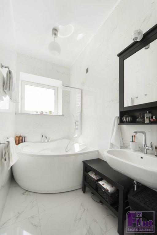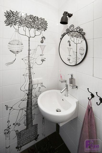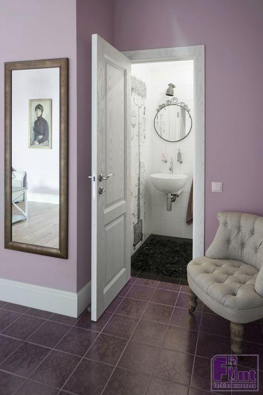 Так как комнаты квартиры выходят на северную сторону, дизайнер решила использовать английские высококачественные краски, палитру которых разработали в этой дождливой стране, и уже много лет используют в отделке, как раз с целью сделать дома светлее и просторнее в недружелюбном климате. В ванной комнате стены и пол облицевали плиткой под мрамор в единой цветовой гамме. В гостевом санузле решено было использовать весёлые чёрно-белые панно, интерьерную поддержку которым создают круглое зеркало в чёрной кованой раме, настенные светильники и фурнитура.