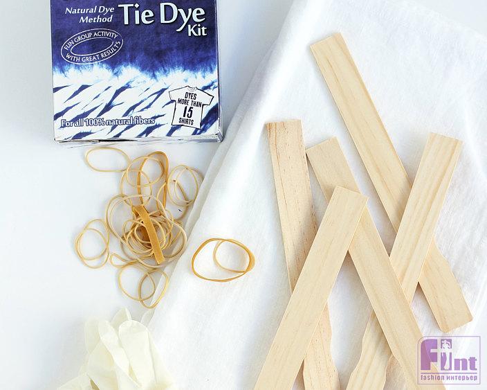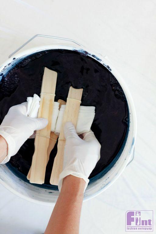Чтобы палочки надёжно фиксировали наше «оригами» из ткани, старайтесь как можно плотнее стянуть палочки резинками. Это важно и для того, чтобы резинки не слетели с палочек при помешивании ткани в ёмкости в процессе окрашивания.