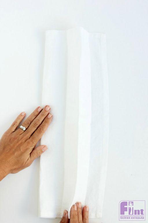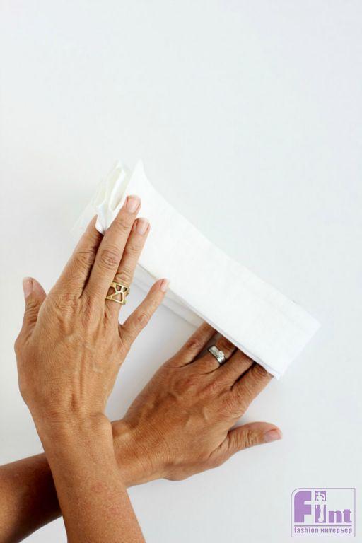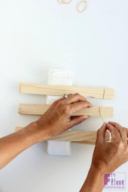 Шаг 2. Складываем салфетки. Сложите салфетки, как показано на фото и закрепите их с помощью деревянных палочек и резинок. В местах, где палочки плотно касаются салфеток, окрашивания нее произойдёт и это создаст необходимый нам узор.