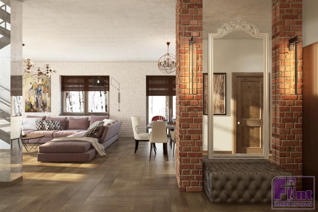 В интерьере гостиной, по замыслу дизайнера, доминирует большая диванная зона, совмещённая с зоной ТВ, и стильный подвесной камин. Кирпичные стены в гостиной скрыты под белой краской, но для уличной стены сделано исключение – она играет роль акцентной стены, выделяясь в интерьере гостиной натуральной кирпичной кладкой тёплого терракотового оттенка.