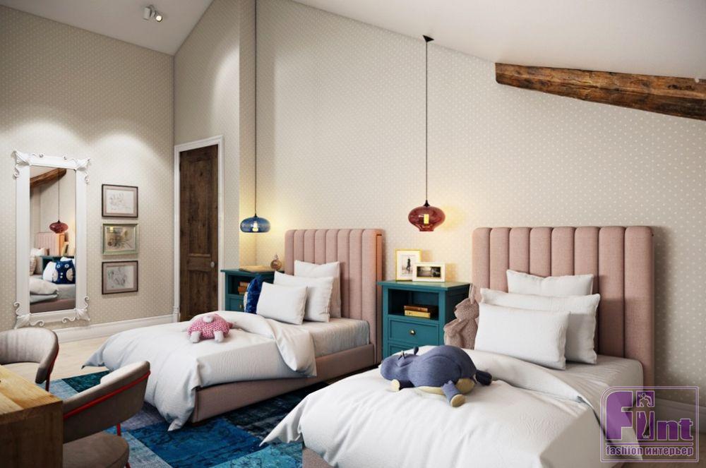На втором, мансардном этаже разместили приватные помещения: ещё одну гостевую спальню, детские, ванную комнату, а также хозяйскую спальню с санузлом и просторной гардеробной. Дизайн здесь более индивидуализирован, хотя без металла и кирпича тоже не обошлось.