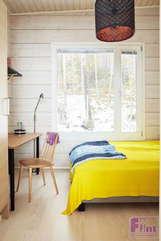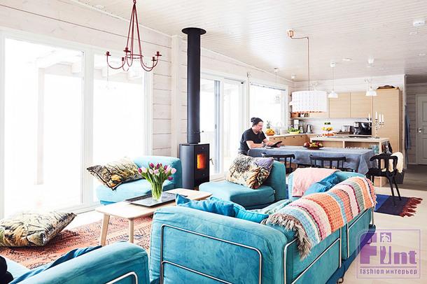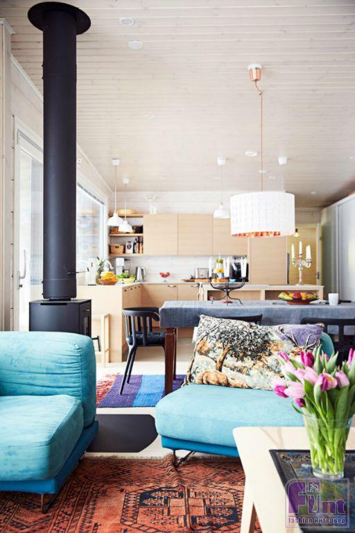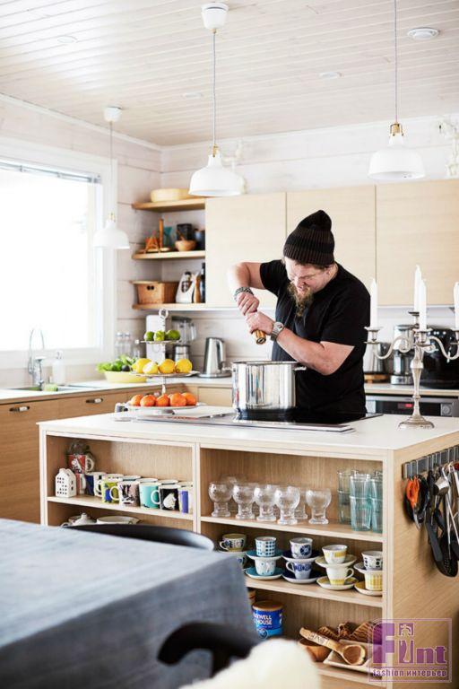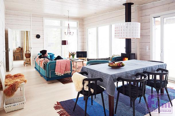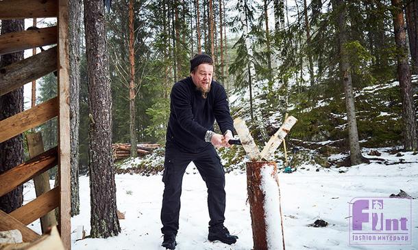 Проектирование сауны стало для Вилле очень интересным занятием. На плане он нарисовал два больших окна — из одного открывался обязательный вид на озеро. Цветовую гамму для сауны он тоже выбрал сам: чёрный и цвет натурального дерева. Интерьер коттеджа - также творение семьи Хаапасало. Оттенок стен — светлый и нейтральный, на таком фоне хорошо смотрится яркая мебель. Несмотря на то, что Вилле всегда нравились более тёмные тона, здесь он хотел больше света, а главное, чтобы природное окружение хорошо просматривалось даже изнутри. Ведь самое главное здесь — большие окна с видом на озеро.