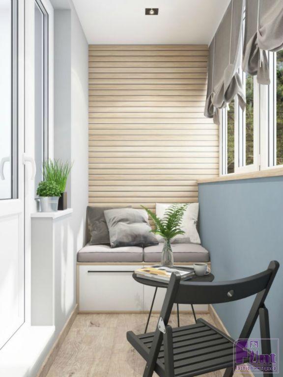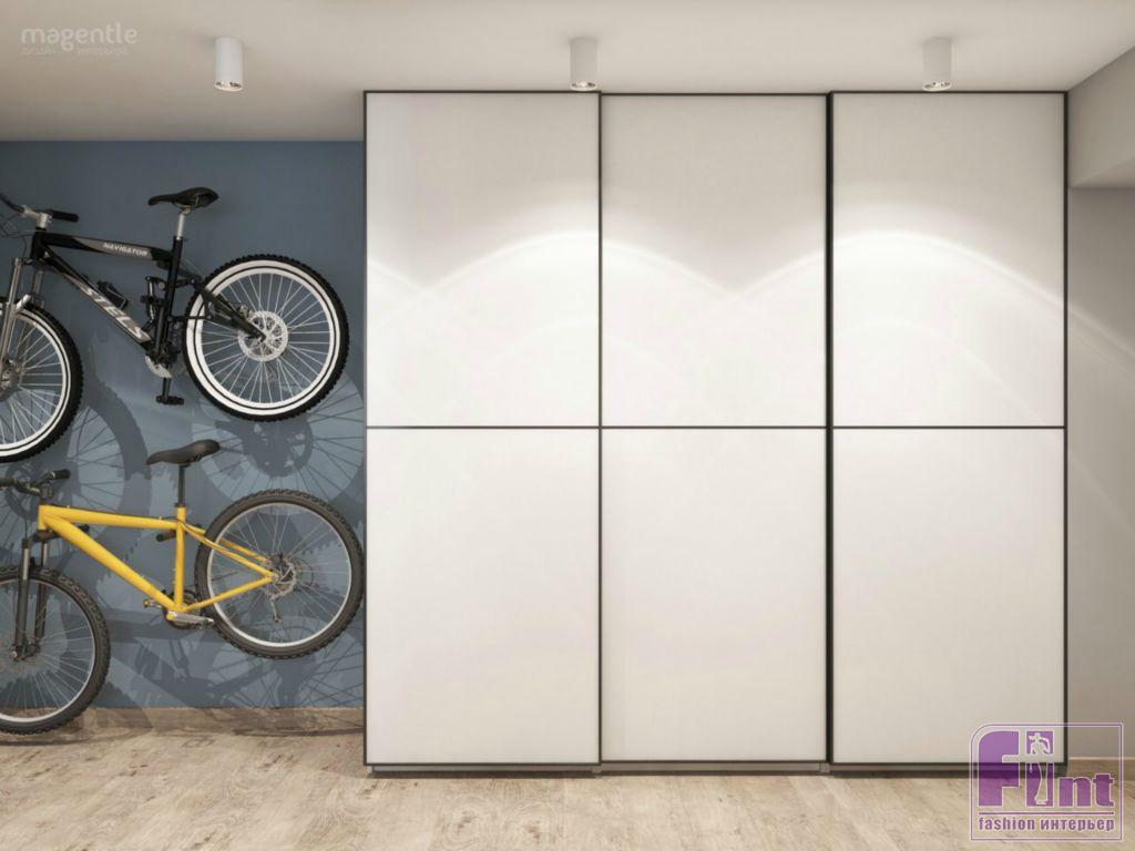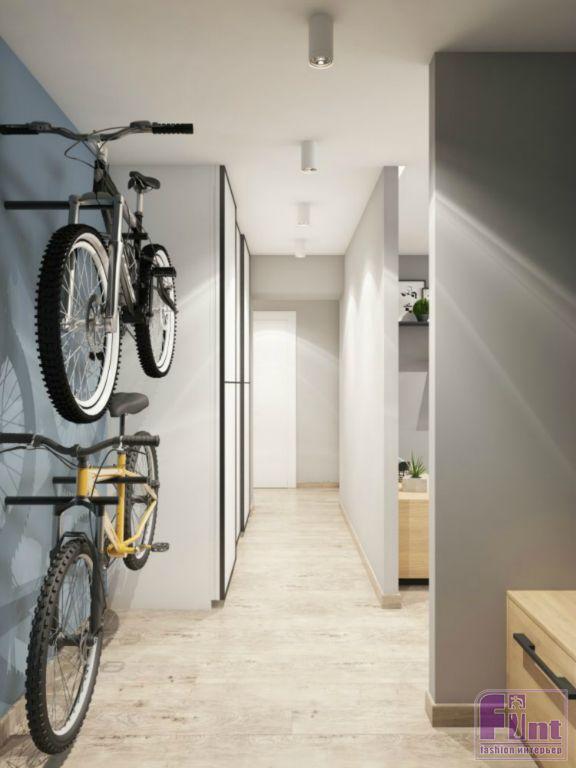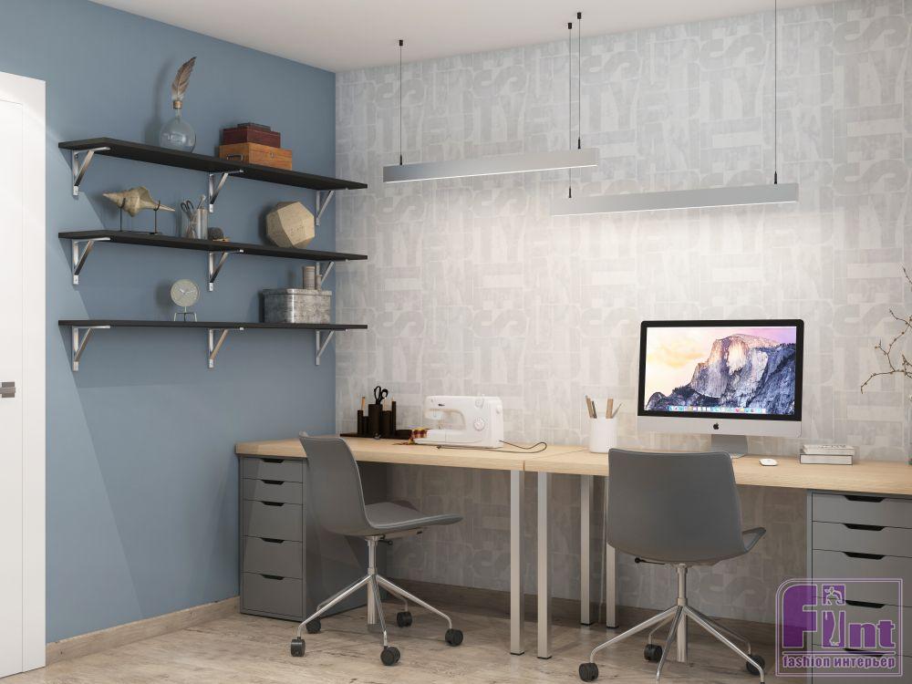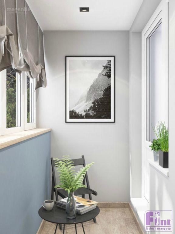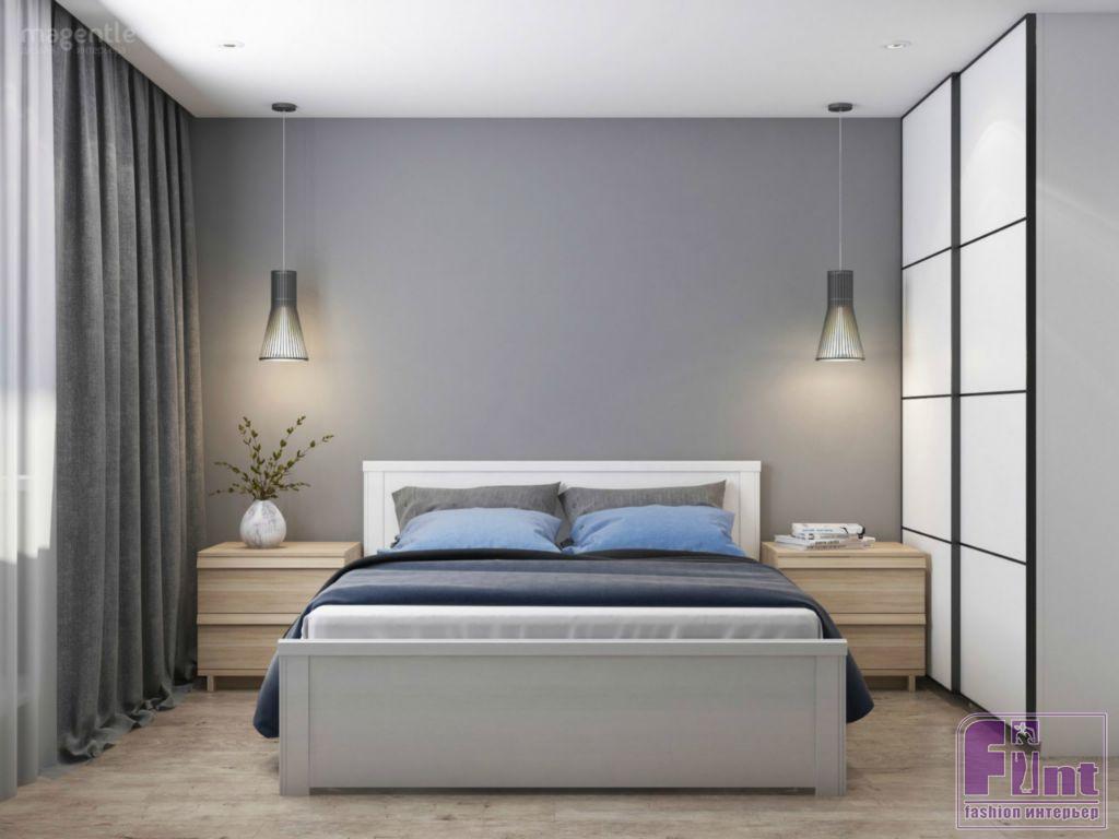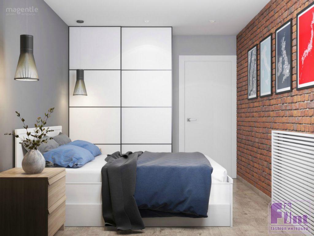В наиболее чистом виде минимализм представлен в спальне. Крашеные в деликатный серо-голубой тон стены, неприметная и скромная мебель в светлых тонах, подвесные светильники индустриального стиля – всё это отлично формирует привязку спальни к общему стилевому решению квартиры. На утеплённом и застеклённом балконе-лоджии была реализована комфортная лаундж-зона с удобным диваном и объёмными системами хранения вещей.