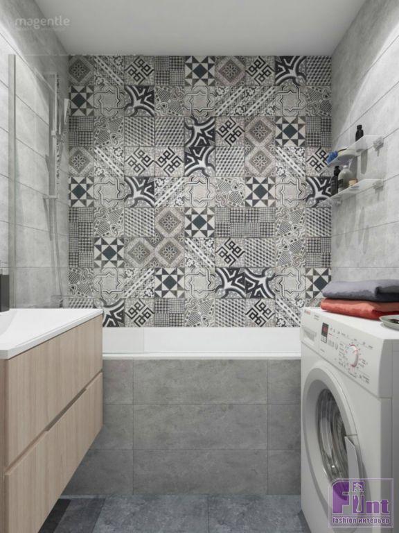 Небольшая по габаритам ванная комната отделана плиткой и керамогранитом. Несмотря на скромные размеры санузла, дизайнеру удалось разместить в нём всё необходимое для жизнедеятельности молодой семейной пары.
