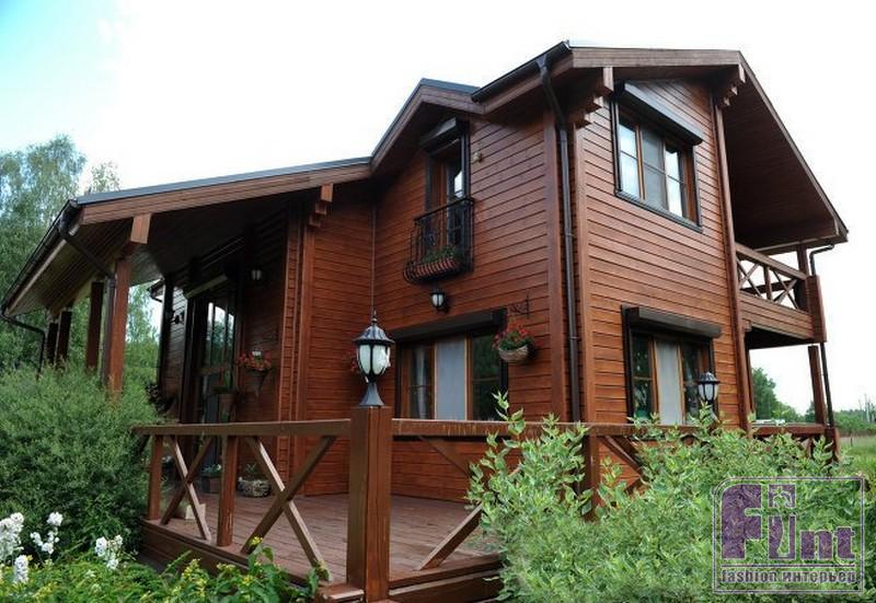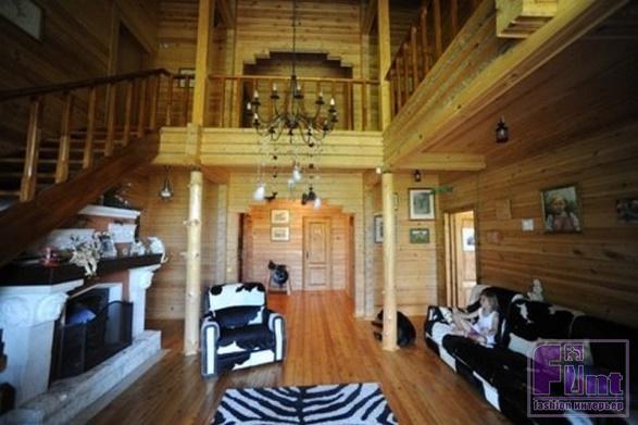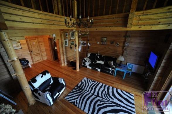 Коттедж полностью построен из дерева. Гостиная имеет популярный на сегодняшний день «второй свет» для увеличения пространства. С потолка свисает огромная люстра с лампочками, стилизованными под свечи. На втором этаже расположены спальни с небольшими балкончиками хозяев дома и их детей.