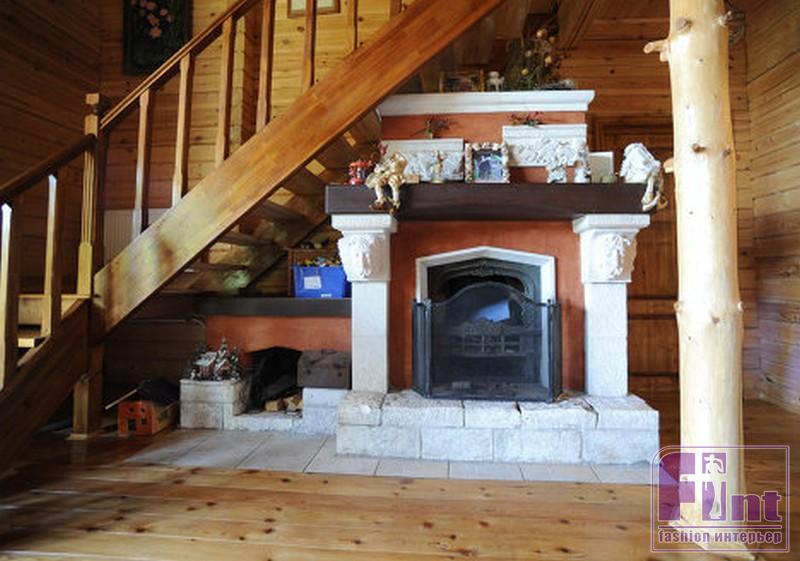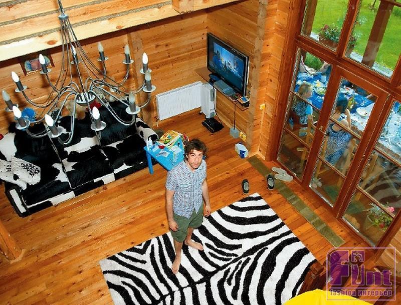 В гостиной установили большой диван с обивкой, имитирующей натуральную шкуру, и в такой же чёрно-белой расцветке ковер, напоминающий раскраску зебры. В обеденной зоне деревянный стол прямоугольной формы и белый камин под лестницей на второй этаж. Камин, кстати, пришлось перекладывать. Строители при выкладке допустили образование свищей, из-за чего хозяева чуть не лишились дома в пожаре, которого удалось избежать по чистой случайности.